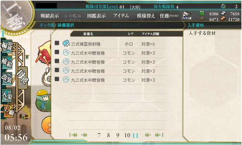 対ボス潜水艦1人目。コモン爆雷2個とソナーで目標値の対潜50に