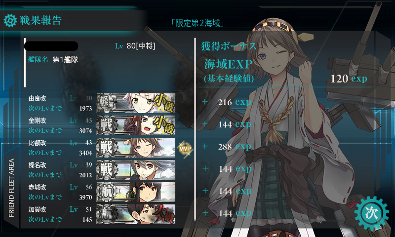 榛名小破、夜戦なしA勝利(ゲージ75%)