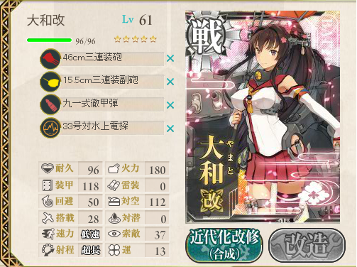 対空ほしかったら九一を三式に換装するぐらい、あと電探は上位にアップしていけば「外さない」戦艦が出来るぜ。