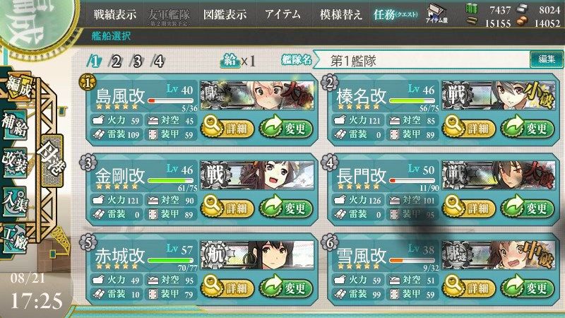 2回目はボス前までは単横でしのぎ、状態は金剛中破、他は小破2とかすり傷で決戦へ。