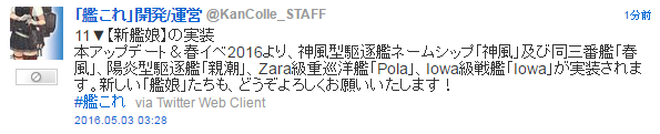本アップデート&春イベ2016より、神風型駆逐艦ネームシップ「神風」及び同三番艦「春風」、