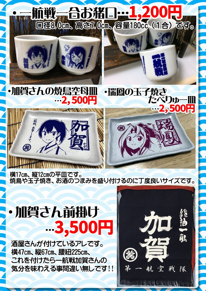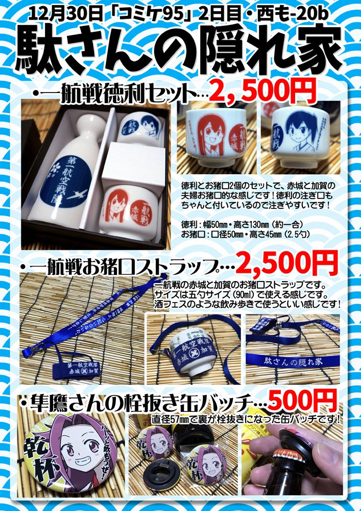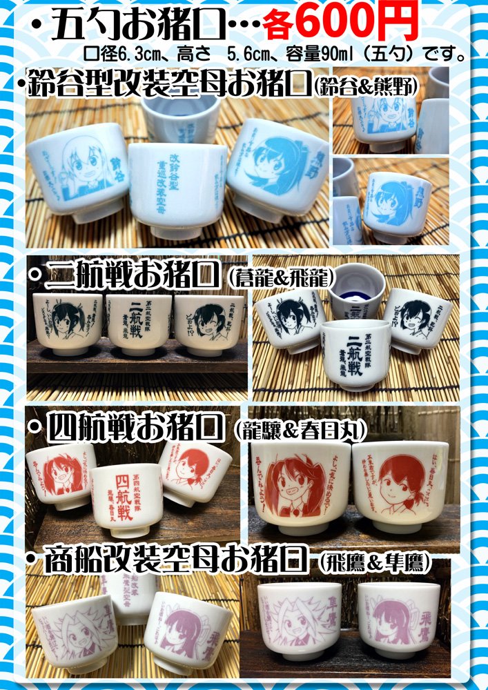 艦これの一航戦中心の空母サークルです。徳利やお猪口と言った酒器を作っております。新作は「一航戦徳利セット」「一航戦お猪口ストラップ」「隼鷹さんの栓抜き缶バッチ」です。